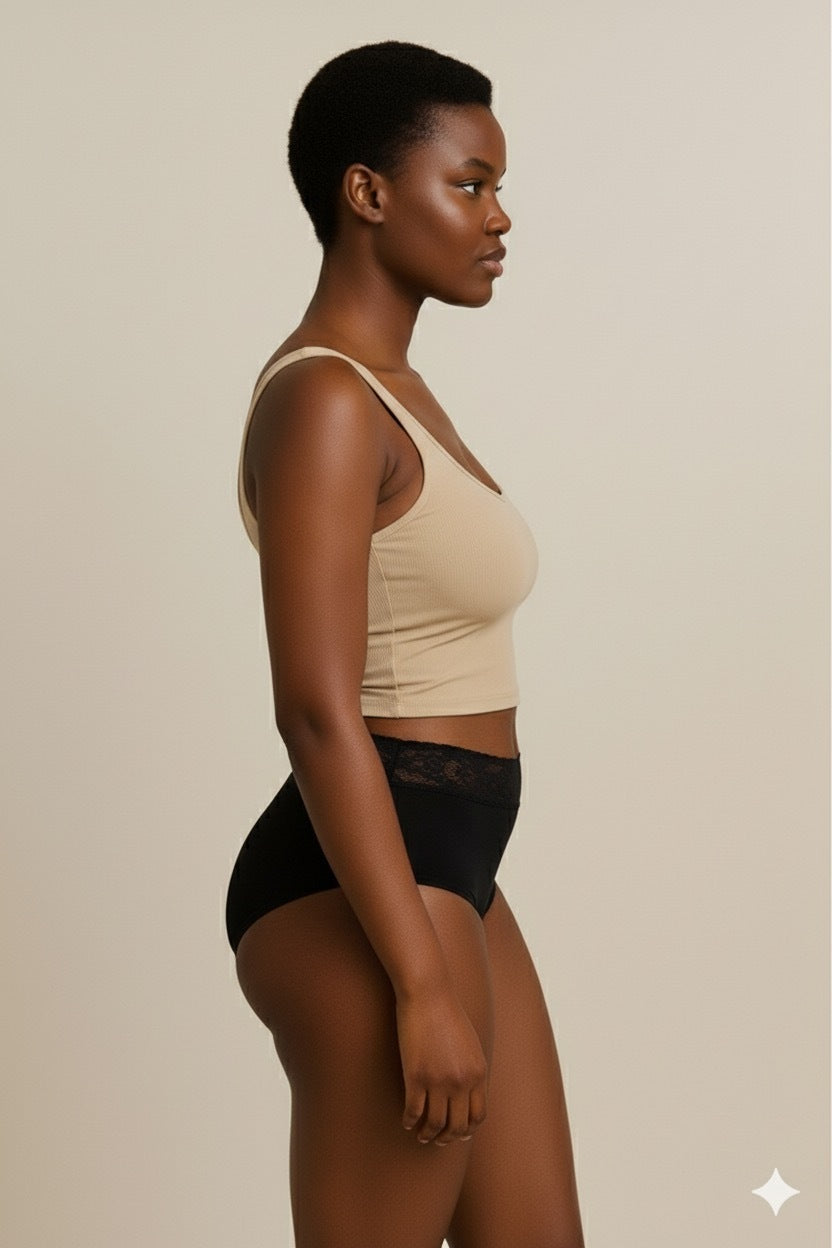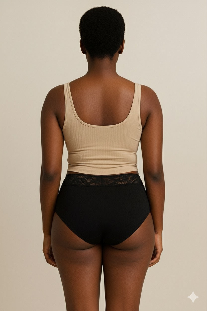 Nos culottes menstruelles offrent jusqu'à 12 heures de protection, vous permettant de traverser votre journée ou votre nuit avec confiance et confort. Conçues pour s'adapter à différents flux, de léger à abondant, elles absorbent l'équivalent de 5 à 6 tampons, ce qui les rend idéales pour une utilisation prolongée sans souci de fuite ou d'inconfort.